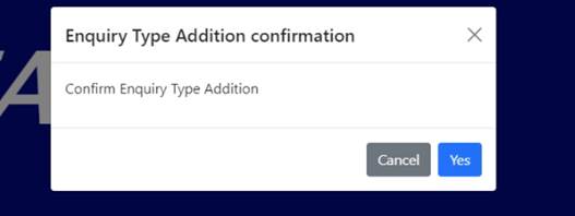 Step 5: Click on the yes button on the confirmation notification to confirm the addition or the cancel button to return to the enquiry type details screen.